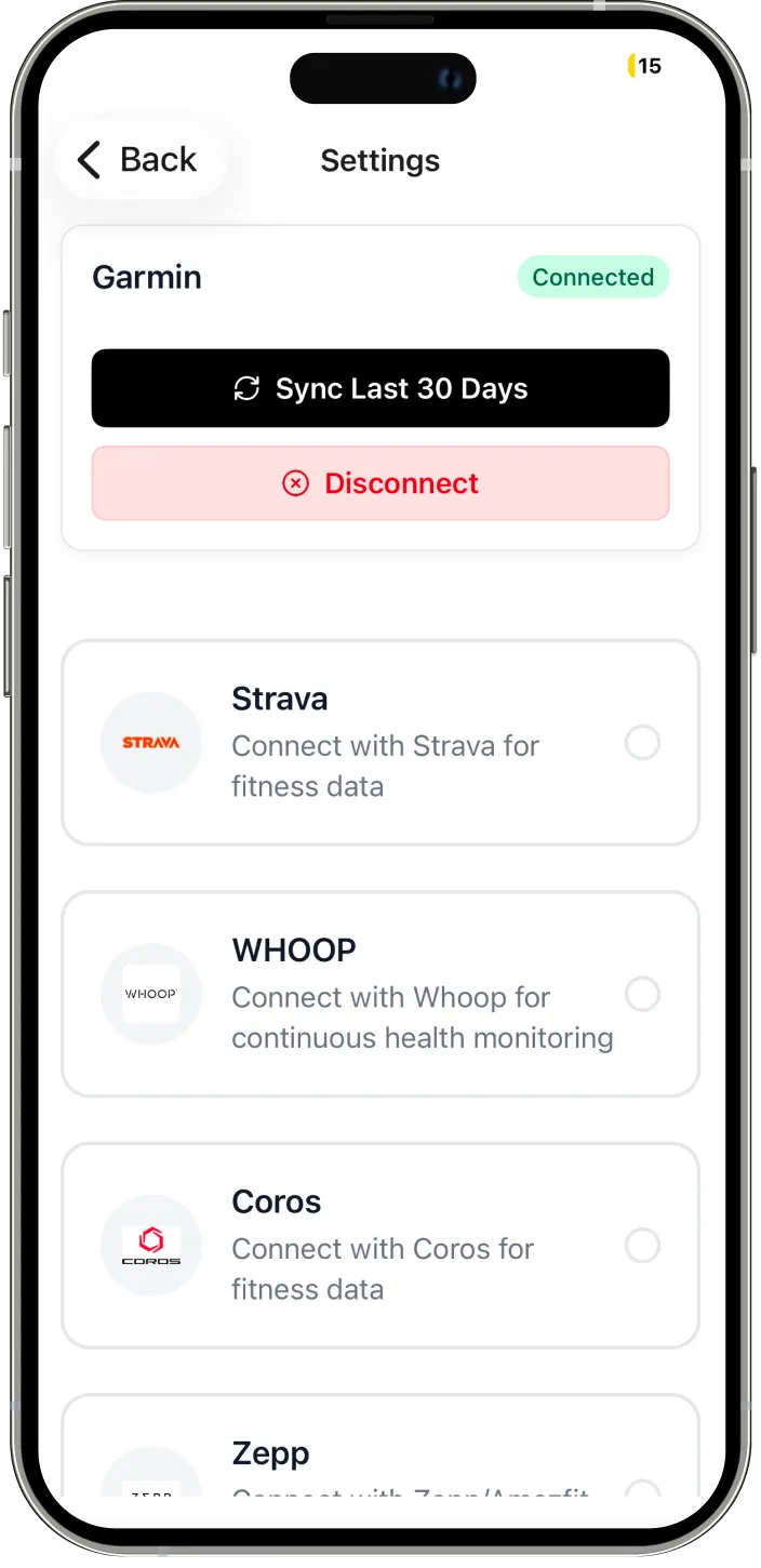 Custom tracking app — integrated with Garmin, Strava, Amazfit